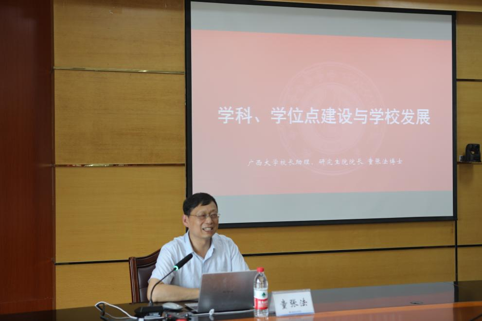 6月29日下午,广西大学校长助理、研究生院院长、博士生导师童张法教授在飞天楼517会议室,为我校教师作了关于《学科、学位点建设与学校高质量发展》的专题报告。校长吴尽昭,学工部(处)、发规处、人事处、教务处、科技处、国交处负责人,各教学单位分管科研工作负责人以及各学科和硕士点方向负责人出席并聆听了报告。